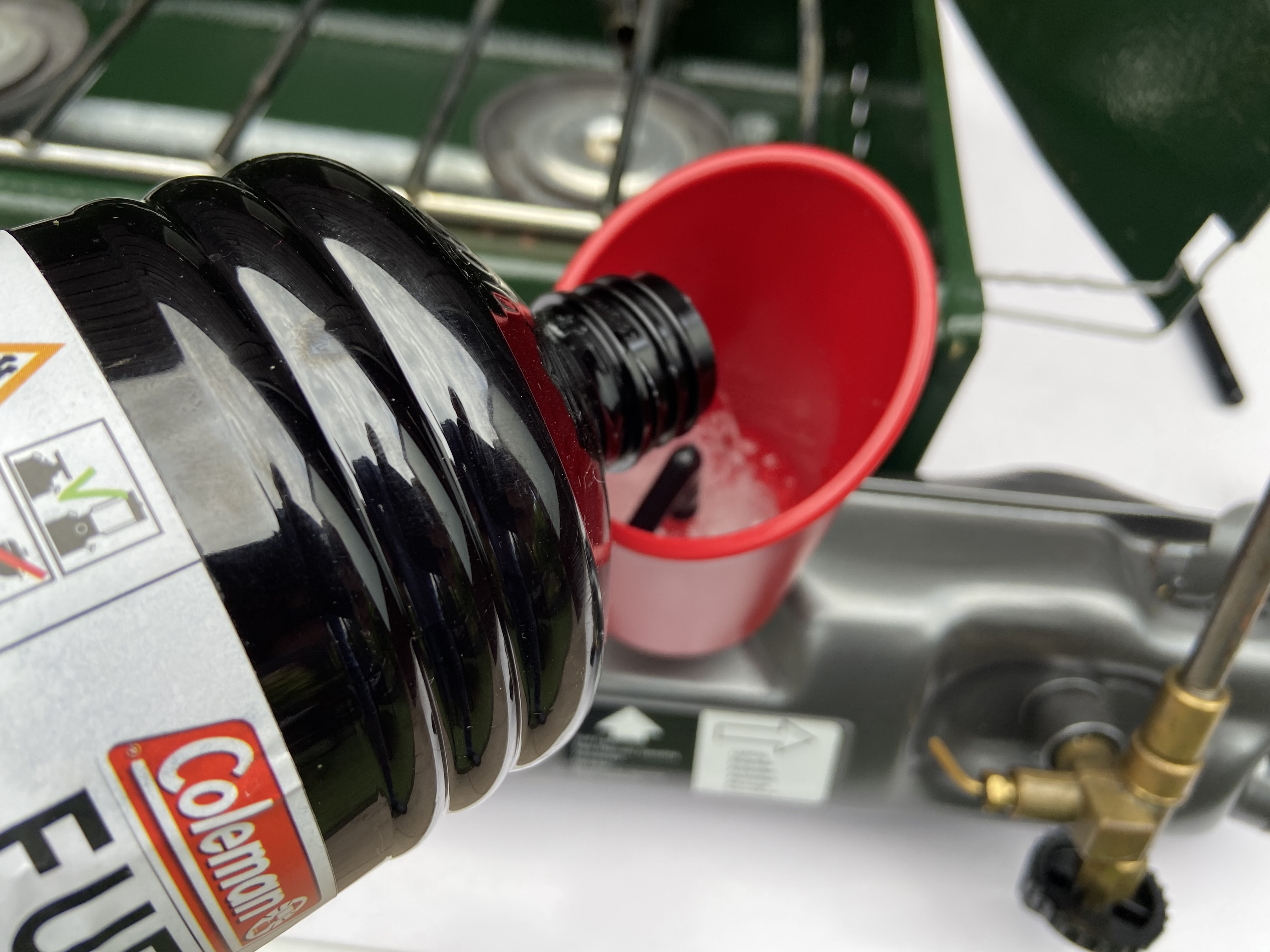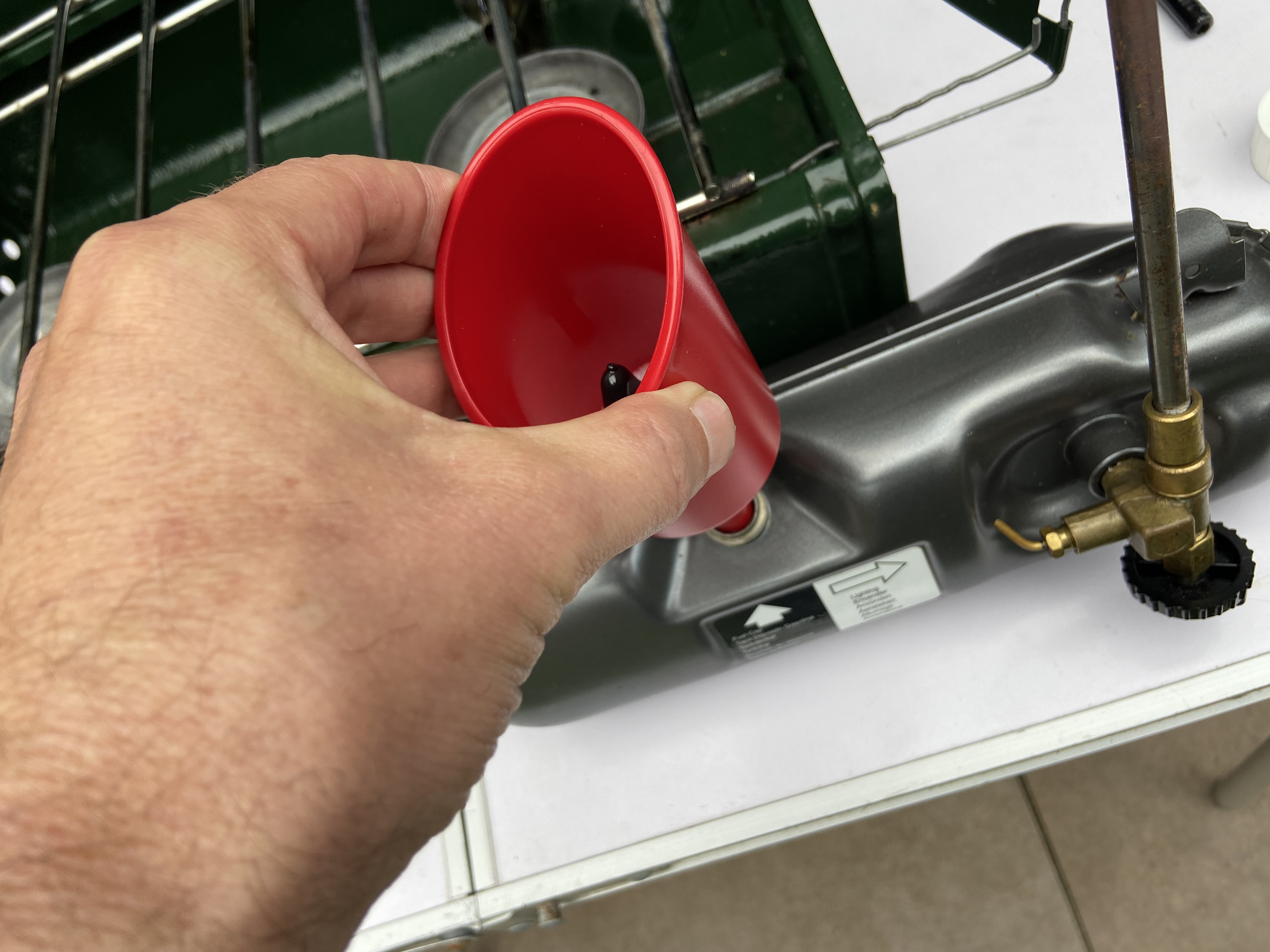 Stap 3 Haal de trechter eruit. De Coleman Fuel die nog in de trechter staat loopt nu de tank in. |